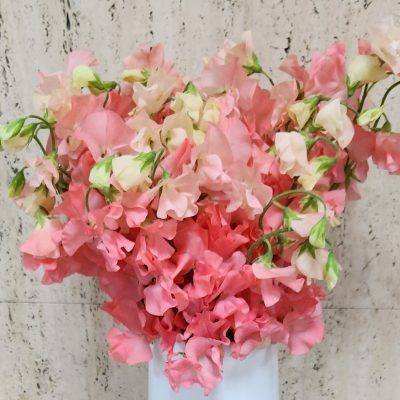 金沢市役所のエントランスホールに飾っているお花です。 今週のお花は「スイートピー(サーモン、ステラ)」です。 原種のスイートピーは、薄紫色の小さなお ・・・